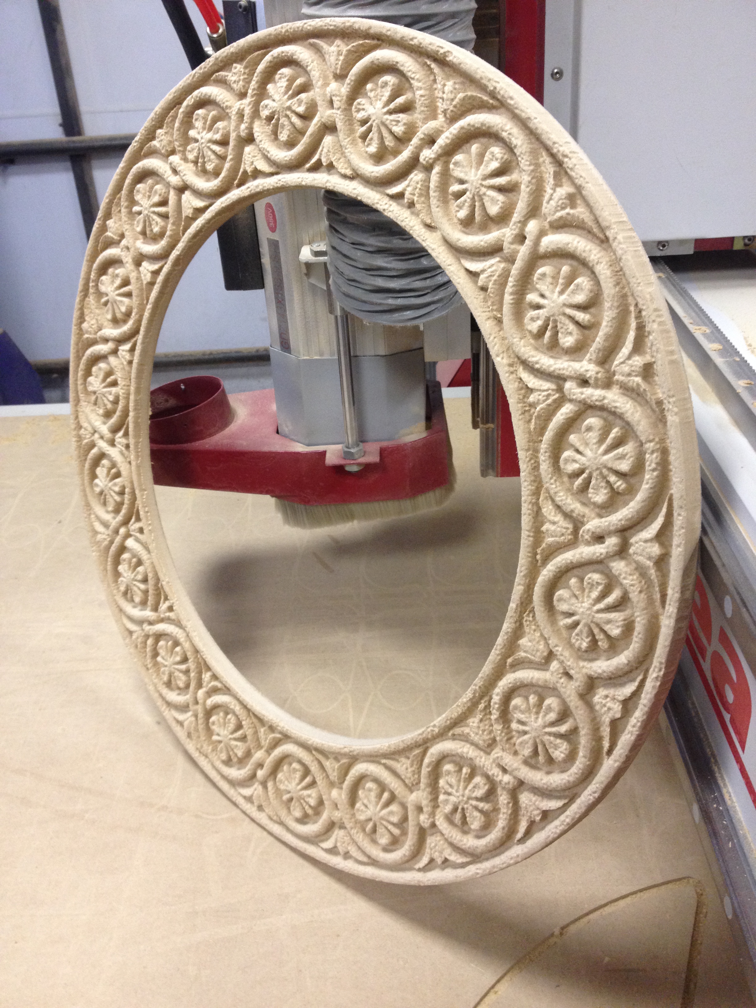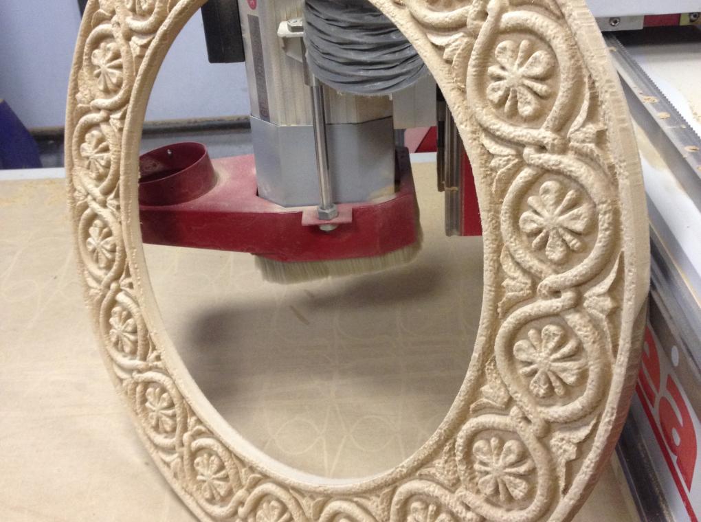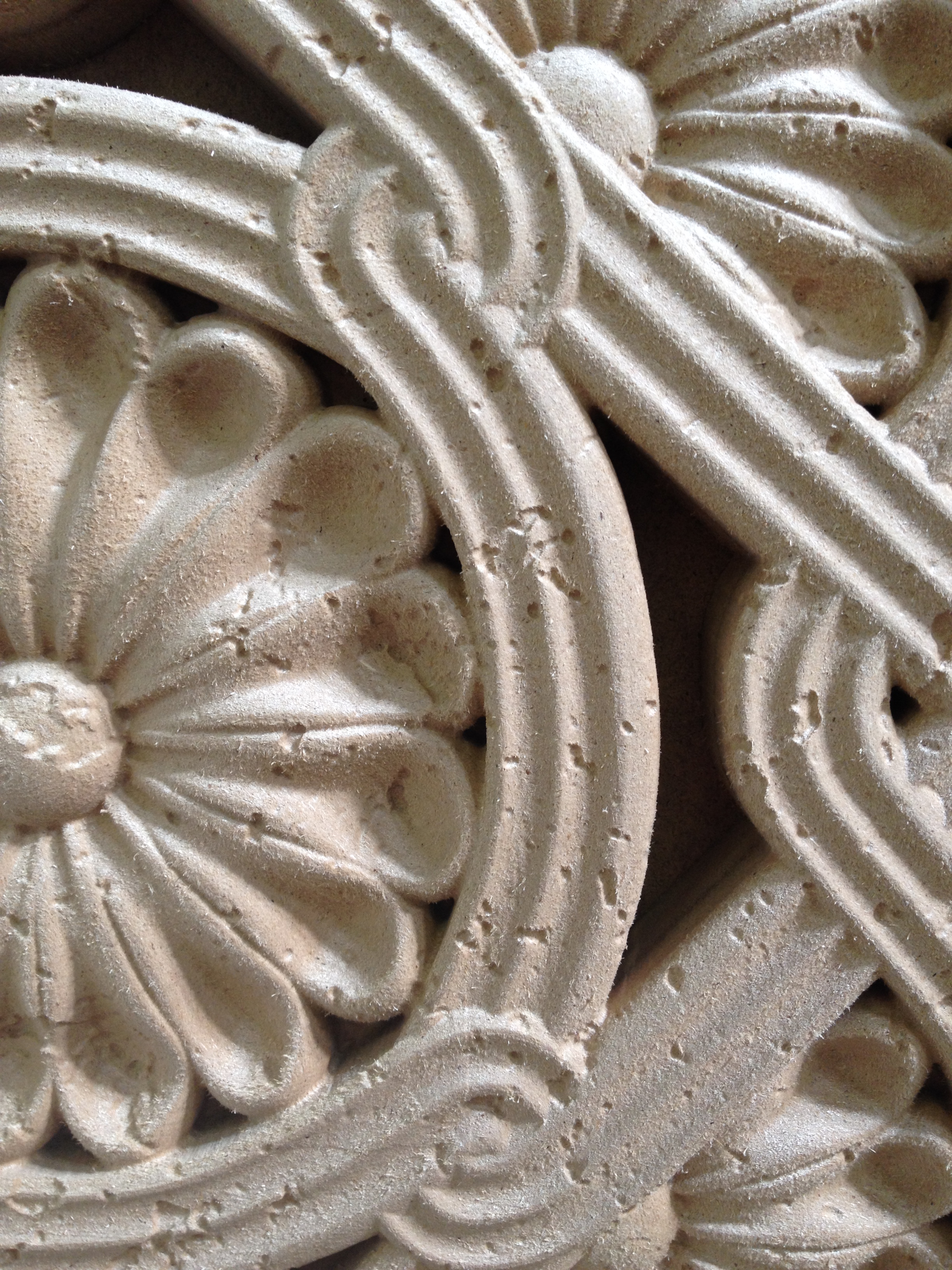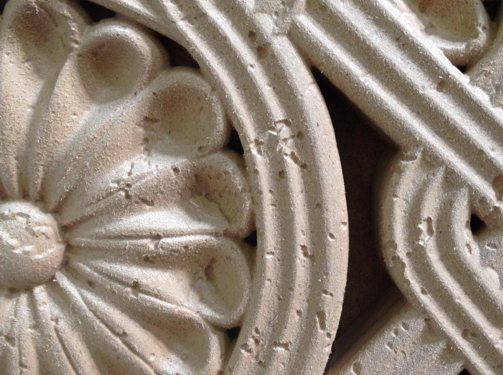 Щербатая поверхность достаточно натурально имитирует песчаник при дальнейшей отливке из искусственного камня. Модель мы произвели из МДФ, хотя и были сомнения перед фрезеровкой о том, получится ли сделать прочную модель с рытвинами на поверхности. Но в итоге всё получилось, заказчик доволен.